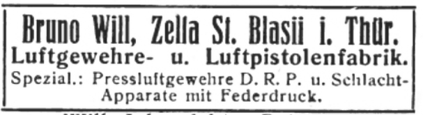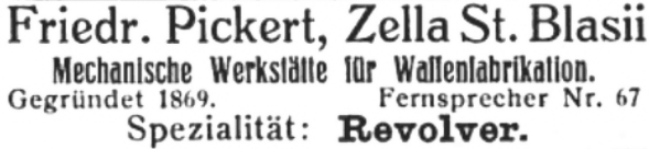 Die berühmtesten Firmen in Mehlis sind F. Reuß; G. Schilling, G. Schmalz und in Zella Klett und Söhne, Gebrüder Decker; G. Greßmann; G. Reißmann; L.und B. Barthelmes; R. Anschütz; L. Sauerbrey. Als Büchsenmacher verdienen noch ihr Geld Pistor und Kost.